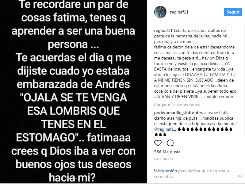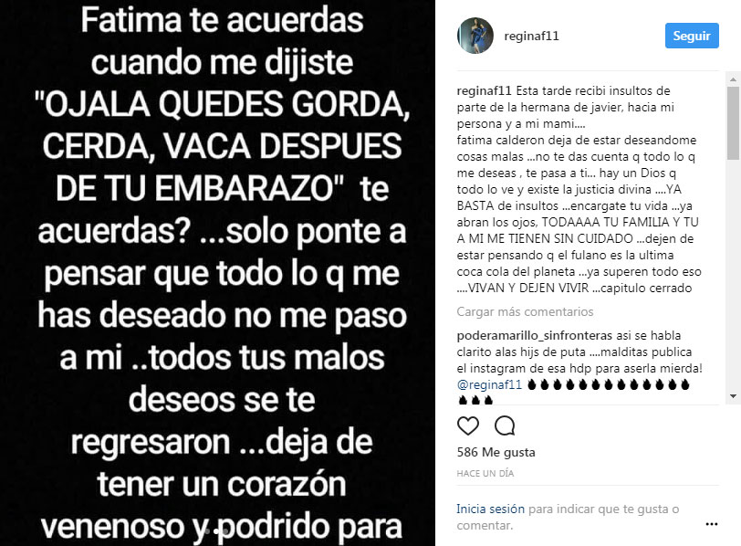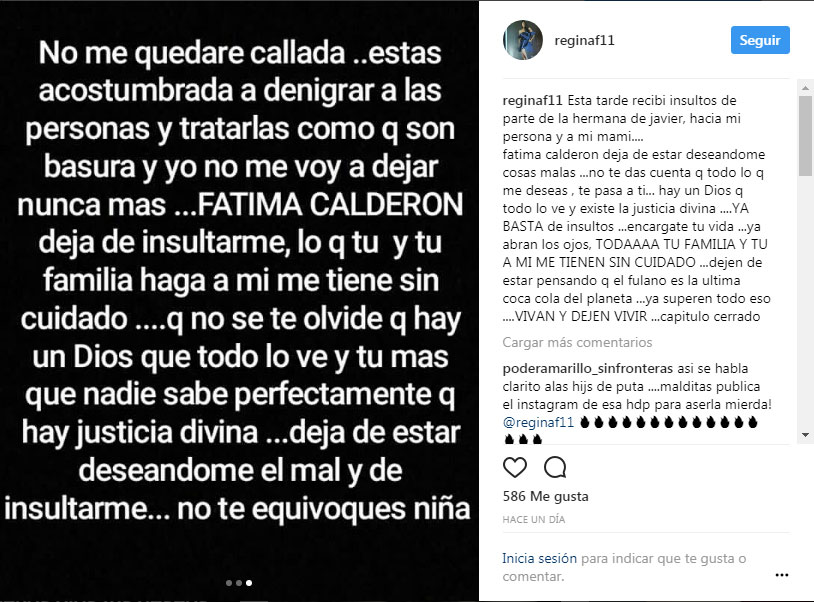 "Fátima Calderón deja de estar deseándome cosas malas ...no te das cuenta que todo lo q me deseas , te pasa a ti... hay un Dios que todo lo ve y existe la justicia divina ....YA BASTA de insultos ...encárgate tu vida ...ya abran los ojos, TODAAAA TU FAMILIA Y TU A MI ME TIENEN SIN CUIDADO ...dejen de estar pensando que el fulano es la ultima coca cola del planeta ...ya superen todo eso ....VIVAN Y DEJEN VIVIR ...capitulo cerrado", escribió Regina en Instagram.