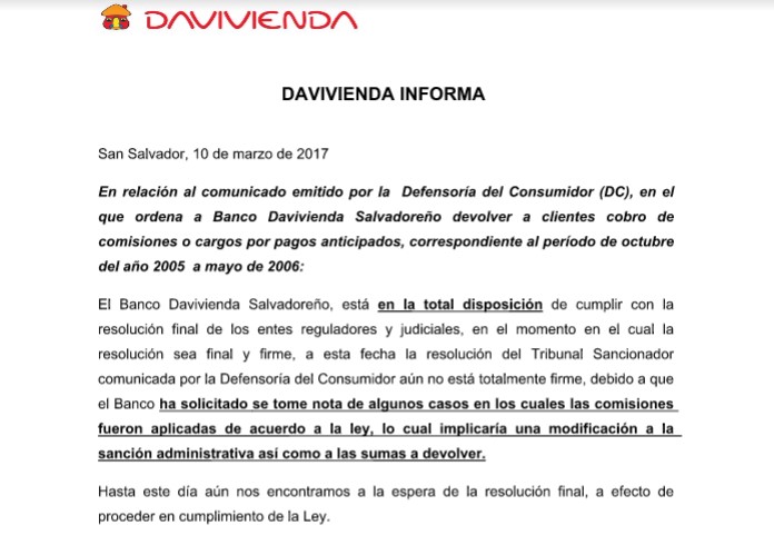 El Tribunal Sancionador de la Defensoría del Consumidor emitió una resolución que obligará al banco Davivienda a reintegrar la suma de $451,357.78 a 203 personas, y pagar una multa de $453,099.60 por infracciones a la Ley de Protección al Consumidor.