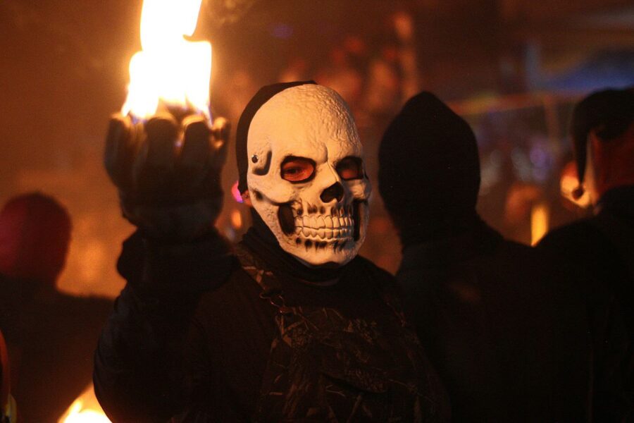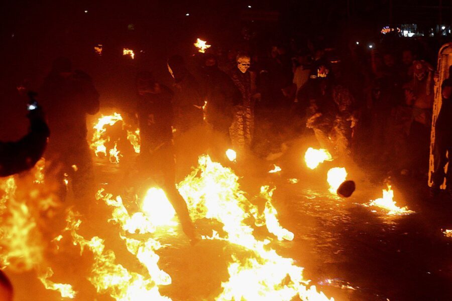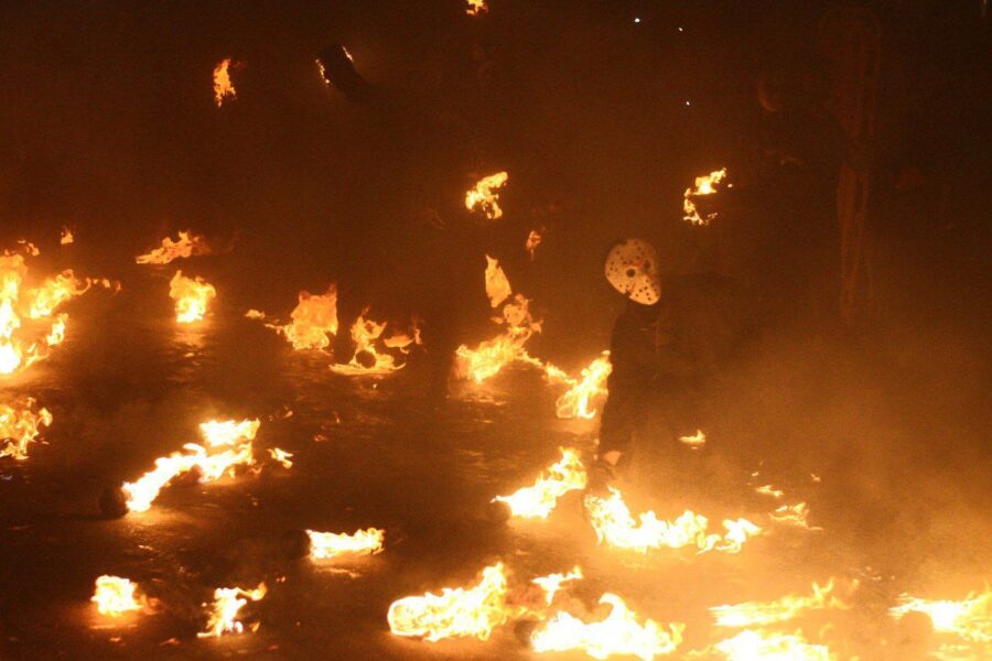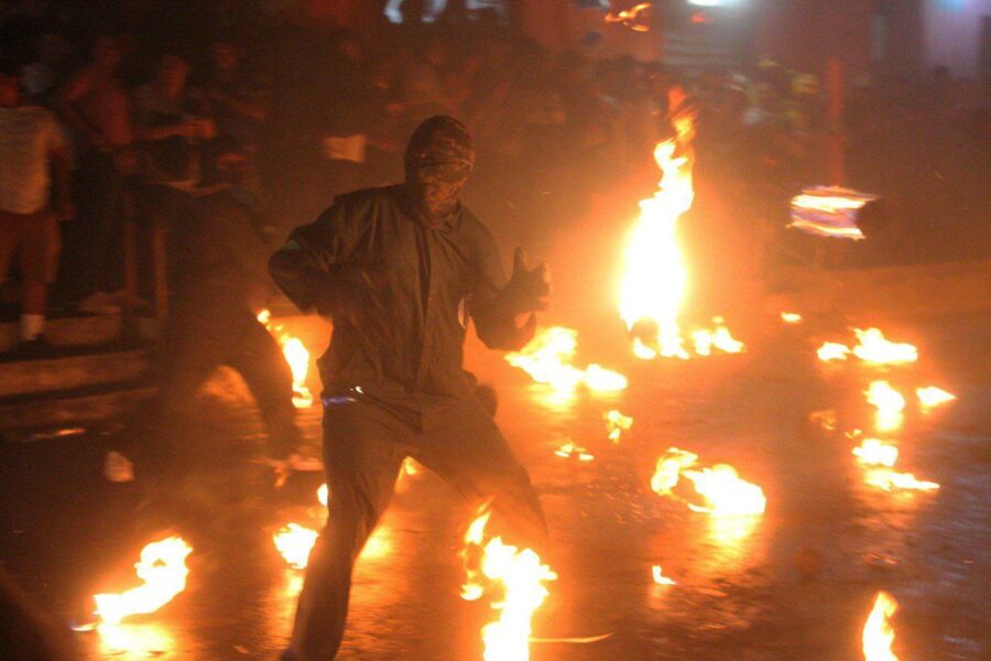 A las 7:30 de la noche, los tradicionales toritos dieron inicio al espectáculo. Con sus chispas y fuegos artificiales cruzando entre la multitud, la adrenalina comenzó a apoderarse de los presentes. Apenas una hora más tarde, a las 8:40 de la noche, rodaron las primeras bolas de fuego, iluminando los extremos de la calle frente al parque central. Con este gesto se daba inicio a la esperada “guerra de bolas de fuego”. Los encargados de lanzarlas, preparados con pañoletas húmedas en el rostro y la ropa empapada en agua, aguardaban en cada extremo listos para la batalla.