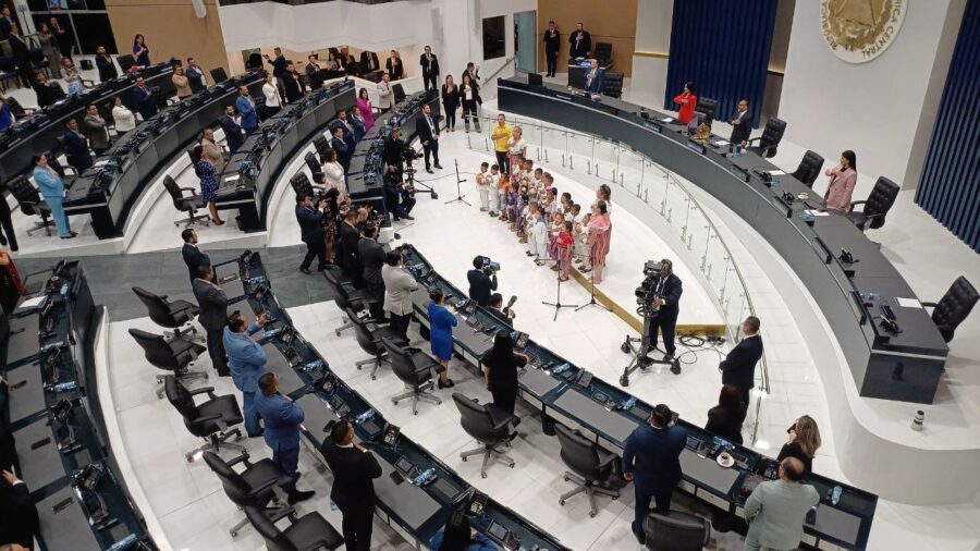 Frente a los diputados de pie, los infantes cantaron emocionados el Himno Nacional, lengua indígena salvadoreña.