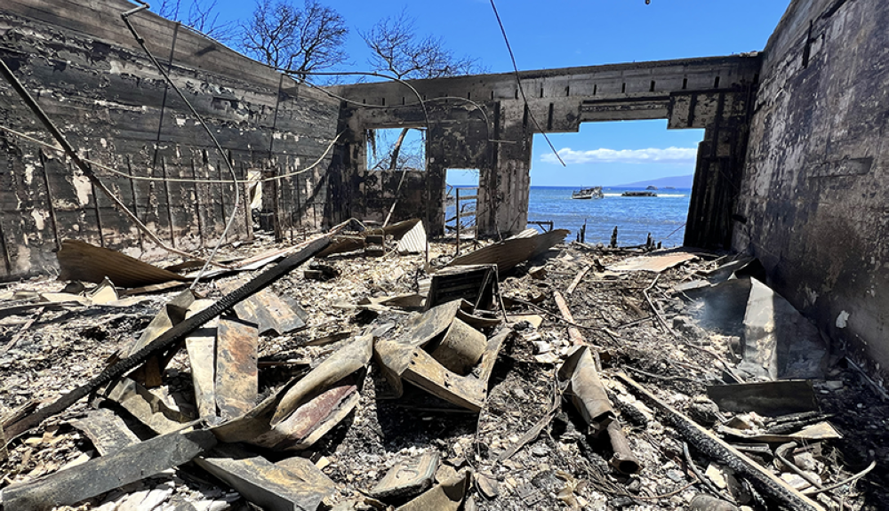 En el paisaje, que hasta asemejaba estar bombardeado, había focos de una esperanza improbable.La iglesia católica Maria Lanakila estaba aparentemente intacta, asomándose sobre las cenizas de la calle Waine'e.