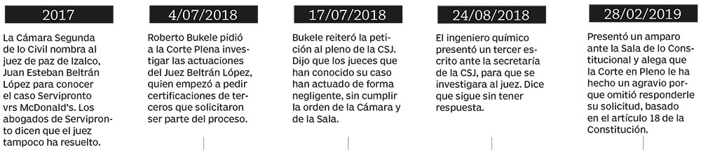 Los abogados de Bukele dicen que en 2012, después que la Sala de lo Constitucional condenara a McDonald’s a pagar los $23 millones, presentaron la demanda de ejecución de sentencia, pero la jueza Primero de lo Mercantil, María Flor Silvestre López, emitió la orden de pago a Servipronto hasta en julio de 2015.
