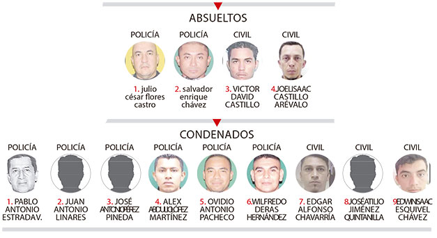 En tanto fueron absueltos: Julio César Flores Castro (jefe del GRP), Salvador Enrique Chávez, Víctor David Castillo Campos y Joel Isaac Castillo Arévalo.