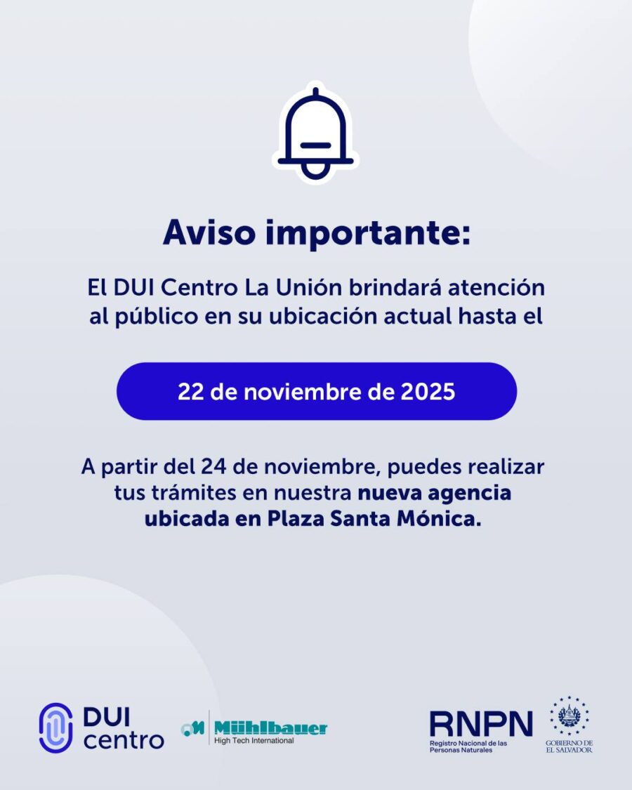 La cuenta oficial de duicentros informó que las nuevas oficinas de La Unión iniciarán operaciones el próximo lunes 24 de noviembre. Este es el cuarto duicentro que es trasladado por decisión de la junta directiva del Registro Nacional de las Personas Naturales (RNPN).