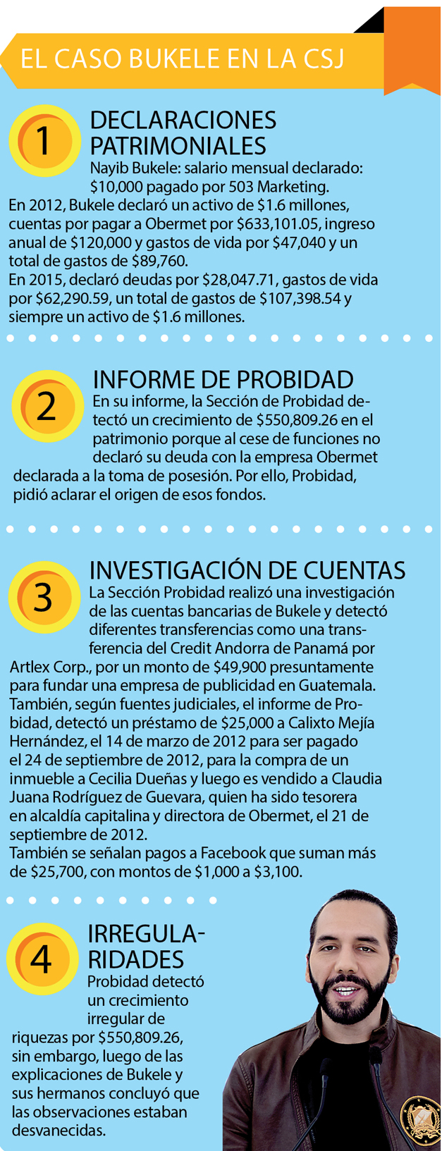 La Sección de Probidad no indagó a Obermet ya que según fuentes judiciales argumentó que indaga a funcionarios y no a sociedades. La CSJ decidió no iniciar juicio civil a Bukele y pidió un proyecto por posible evasión al fisco.