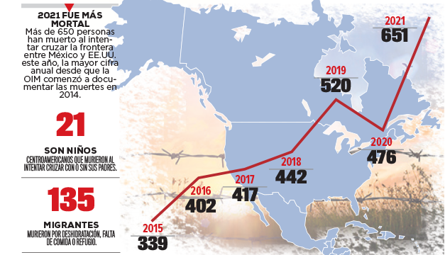 Según un reciente informe anual divulgado por el Proyecto Migrantes Desaparecidos (PMD) de la OIM, la frontera entre EE.UU. y México ha sido la más mortífera para los migrantes en el continente. “Al menos 651 personas han muerto al intentar cruzar la frontera entre México y Estados Unidos este año, la mayor cifra anual desde que la OIM comenzó a documentar las muertes en 2014”, señala el organismo de Naciones Unidas.