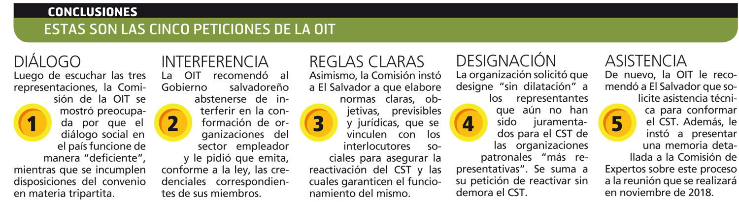 Desde 2015, el organismo internacional le pidió a El Salvador reactivar sin demora el CST por medio de organizaciones “más representativas de trabajadores y de empleadores” a través del diálogo social y que garantice el funcionamiento de este ente tripartito.