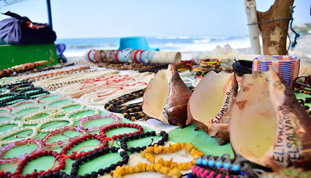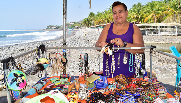 Ana Vides, vendedor en playa El Tunco, se dedica desde hace 10 años al comercio en las costas salvadoreñas. Aunque en un inicio prefirió vender fruta, desde hace tres años encontró en las artesanías un ingreso mucho más fuerte que le ha ayudado a sacar adelante a su familia.