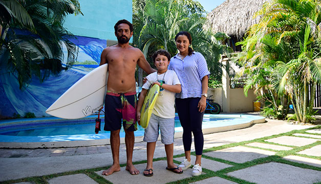 Salvador Alexander Morales junto a su esposa, Mirna Ayala y su hijo dirigen el pequeño hostal en El Tunco. / Diego García