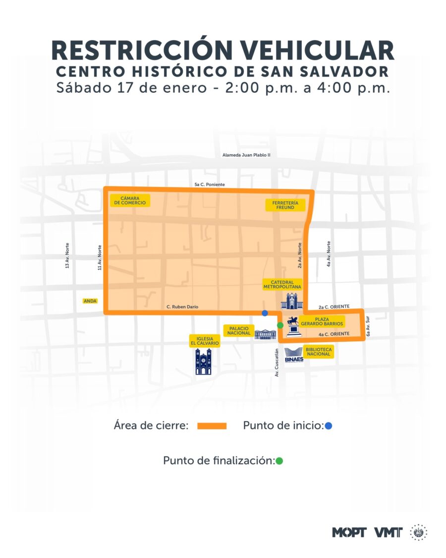 Las restricciones iniciarán el sábado 17 de enero en el Centro Histórico, sobre la 11a avenida Norte entre la calle Rubén Darío hasta la 5a calle Poniente. El área de cierre llegará hasta la 2a avenida Norte y la Biblioteca Nacional de El Salvador (BINAES).
