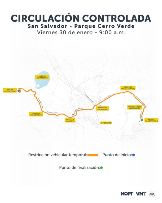 Sin embargo, el martes 20 de enero desde las 9:00 de la mañana habrá un cierre desde Walmart, Constitución. La carrera se extenderá hacia el paso multinivel Integración por la calle a Quezaltepeque, pasará por el redondel Claudia Lars hasta llegar al lago de Coateque y retornará por la calle al Cerro Verde hasta llegar al periférico Claudia Lars.