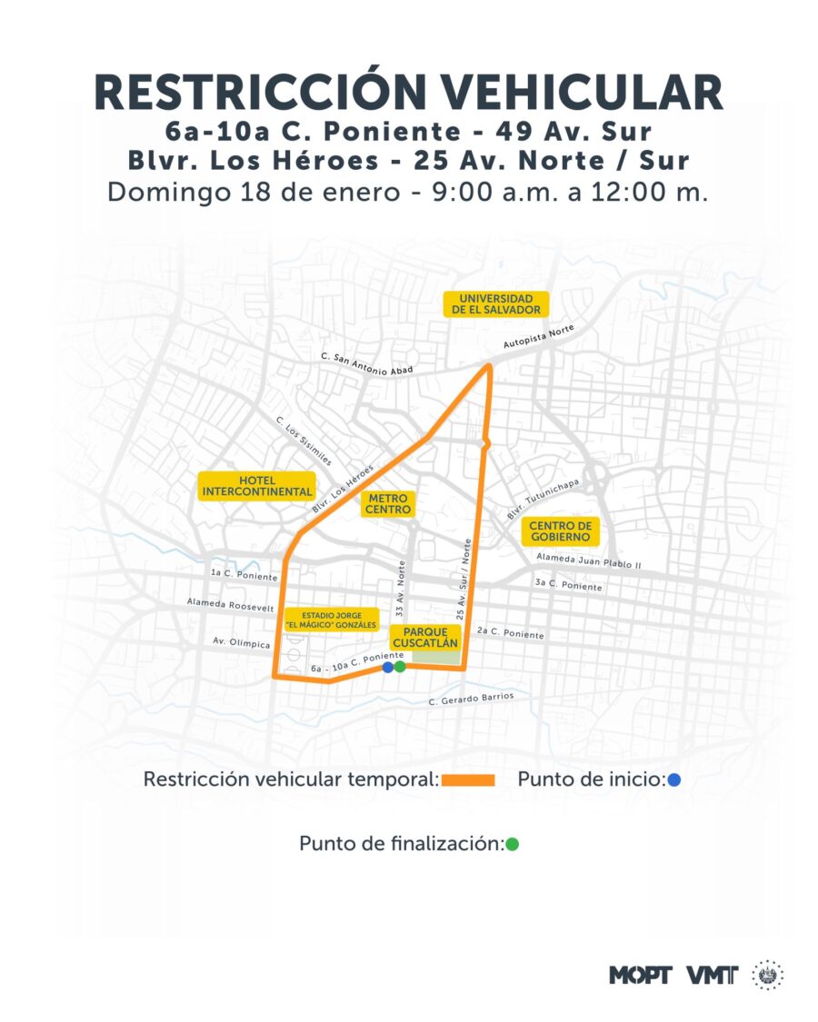 El domingo 18 de enero habrá otro cierre de calles que iniciará en la 6a-10a calle Poniente, detrás del parque Cuscatlán, se extenderá por la 49 avenida Sur y se desplazará por el bulevar de Los Héroes hasta llegar a la autopista Norte cerca de la Universidad de El Salvador (UES) y retornará sobre la 25 avenida Norte hasta llegar a un costado del parque Cuscatlán.