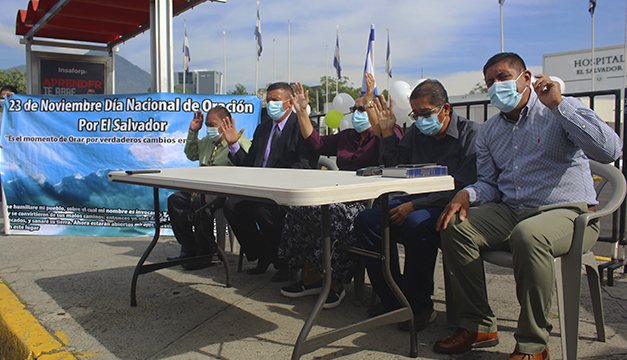 Al finalizar la actividad, los líderes de iglesias evangélicas se levantaron para alzar sus manos y sus oraciones a los pacientes enfermos de covid-19 del Hospital El Salvador./ Gabriel Aquino.