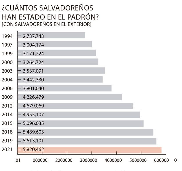 El padrón electoral actual es dos veces la población registrada para votar que había 27 años atrás. Los salvadoreños en el exterior empezaron a incluirse en el registro electoral desde el año 2009.