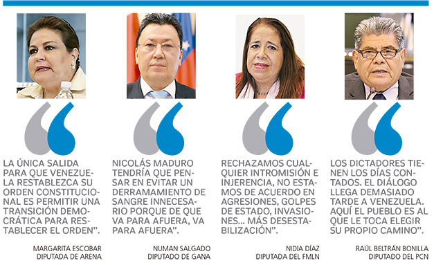“Rechazamos cualquier intromisión, no estamos de acuerdo en agresiones, golpes de Estado, invasiones, que vaya a provocar más desestabilización”, expresó ayer la jefa de fracción del FMLN, Nidia Díaz.