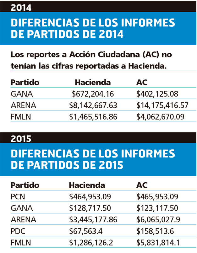 El representante de esa organización, Eduardo Escobar, aseguró que esas incoherencias se las advirtieron al Tribunal Supremo Electoral (TSE) en febrero de 2018, hasta que Hacienda liberó la información financiera de los partidos políticos. Solo en dos años, entre todos los partidos, detectaron una diferencia de $15 mi­llones con lo reportado por dichos institutos políticos al Ministerio de Hacienda.