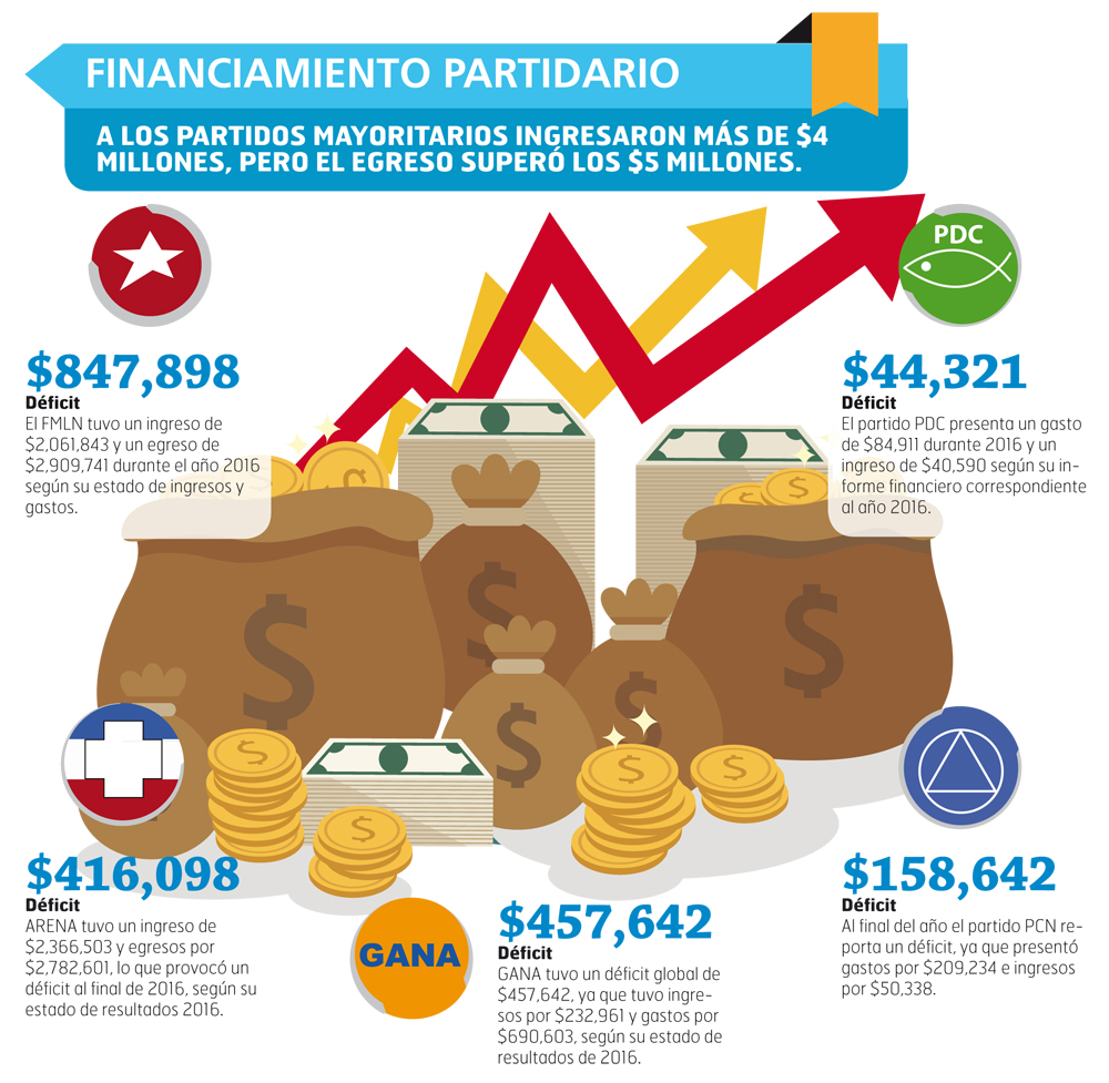 Los partidos con mayores ingresos son ARENA, a cuyas arcas entraron $2,366,503; y el FMLN, con $2,061,843 de fondos ingresados. Con mucha diferencia les sigue GANA, con un ingreso de $232,961 y el resto de partidos.