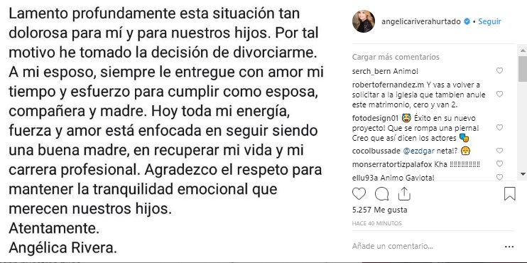 Previo a ello, la revista ¡Hola! aseguraba que Peña Nieto y Rivera llegaron a un feliz término del matrimonio en diciembre del año pasado, justo cuando salieron de Los Pinos, donde era la residencia durante el mandato de Peña.