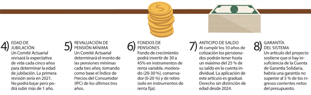Las cotizaciones a los pensionados oscilarían entre 3 % y 10 % de acuerdo al monto de la pensión. Si un pensionado recibe más de ocho veces el monto de la pensión mínima, cotizaría un 10 % de su pensión a la Cuenta de Garantía Solidaria. Si recibe de seis hasta ocho veces la pensión mínima, aportaría 7 %; de tres a seis veces la pensión mínima, cotizaría un 5 %; y, si el monto de su pensión es hasta tres veces la pensión mínima, la tasa de cotización sería 3 %.