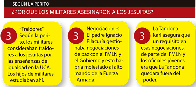 Señala que una de las razones para asesinar a los jesuitas, era que Ellacuría gestionaba negociaciones de paz entre el FMLN y el Gobierno y parte de esas negociaciones era sacar a La Tandona del poder. Terry Karl es una docente retirada de las universidades de Stanford y Harvard, especialista en estudios latinoamericanos y profesor de Ciencias Políticas y ha sido la designada para investigar la masacre de los jesuitas. Ella misma define que ha visitado el país en más de 40 ocasiones para entrevistar personas y revisar documentos como los de la comisión Adhoc, del Comisión de la Verdad, la CIA, el FBI, y los documentos desclasificados del Departamento de Estado de Estados Unidos.