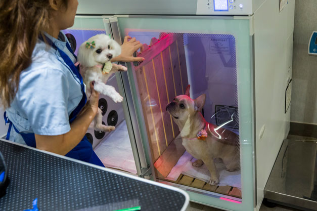 "Los animales domésticos merecen cosas mejores", insiste esta mujer de 30 años, propietaria de 12 perros. "Los perros son muy felices aquí", afirma. "A veces incluso se quedan dormidos durante los tratamientos".