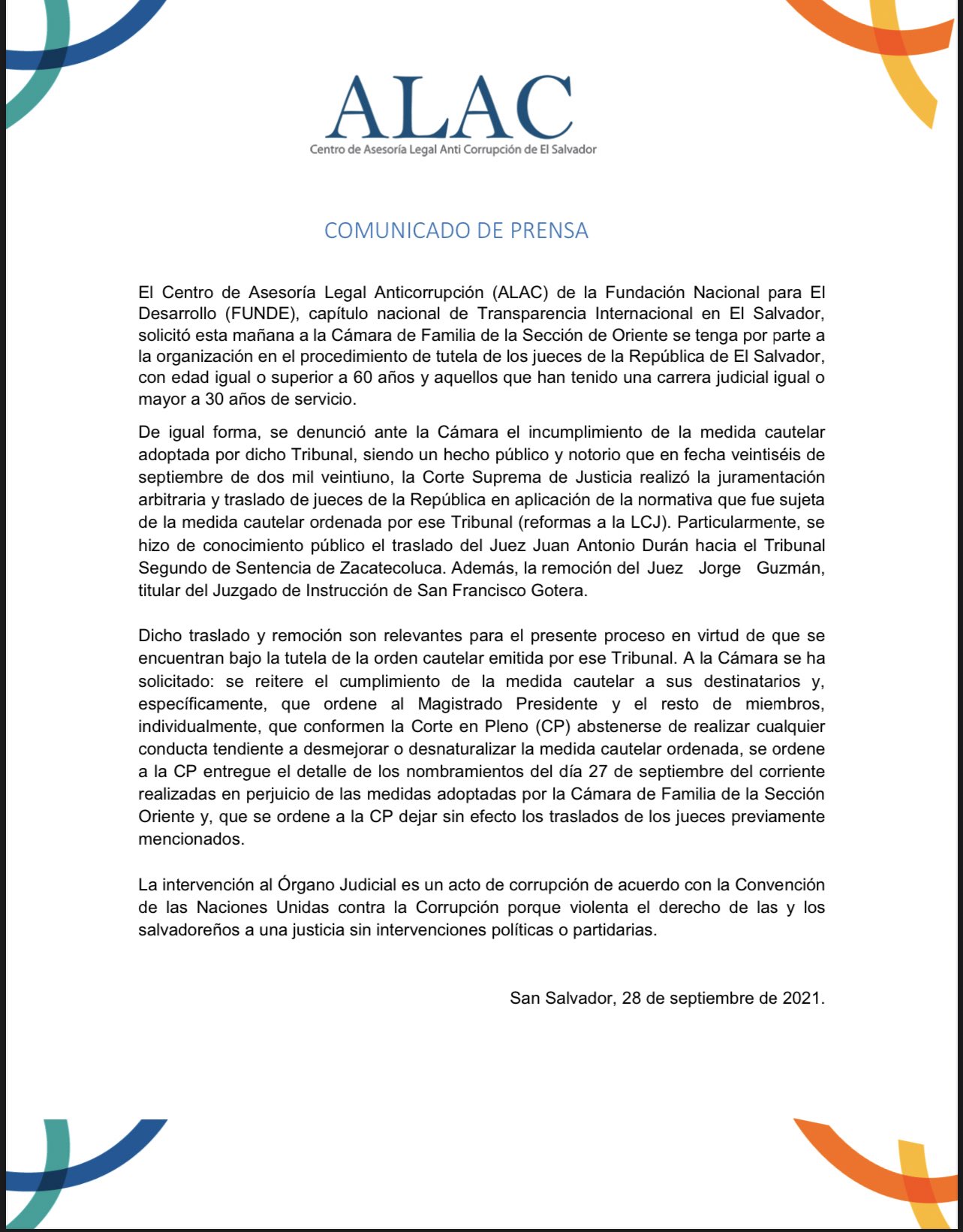 La intervención al Órgano Judicial es un acto de corrupción de acuerdo de acuerdo con la Convención de las Naciones Unidas contra la Corrupción porque violenta el derecho de las y los salvadoreños a una justicia sin intervenciones políticas o partidarias”. Comunicado de ALAC-Funde.