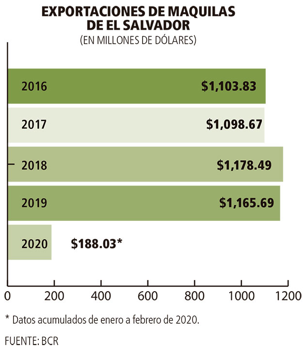 Los datos del Banco Central de Reserva (BCR) indican que la maquila exportó entre enero y febrero de 2020 cerca de $188 millones, esta suma es $12.5 millones adicionales frente al resultado de $175.4 millones de 2019. Al cierre del año pasado, en tanto, las ventas del rubro generaron ingresos a la economía por $1,165.69 millones.