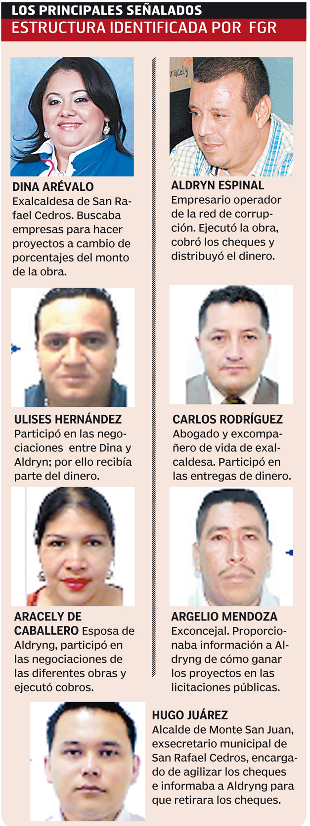 En las pesquisas realizadas por los fiscales anticorrupción, se descubrió que Espinal Fuentes, mencionado como empresario operador de la red de corrupción, cuyos hechos se ejecutaron en el año 2014 cuando la exalcaldesa Concepción Arévalo Chicas, su entonces secretario Hugo Balmore Sánchez Juárez, quien ahora es alcalde de Monte San Juan; y otros empleados de la alcaldía de San Rafael Cedros, supuestamente favorecieron a Espinal Fuentes con las tres obras ejecutadas en los cantones El Copinol, El Magueyal y El Espinal.