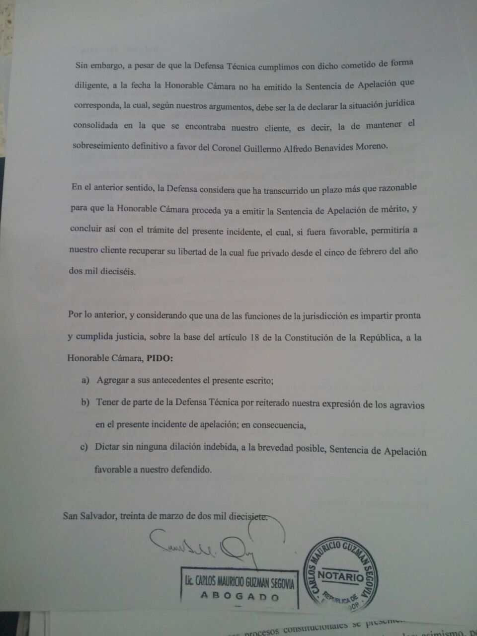 Los abogados defensores del coronel Guillermo Alfredo Benavides Moreno presentaron un escrito a la Cámara Primero de lo Penal pidiendo resolver un recurso de apelación que conocen, luego de la derogatoria de la ley de Amnistía.