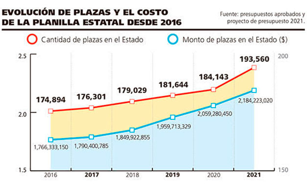 Al final de 2021 si el presupuesto no se modifica, el Estado habrá crecido 10 % aunque su costo, un 23 %. Durante el último año el crecimiento en el costo de planilla sería del 6 %.
