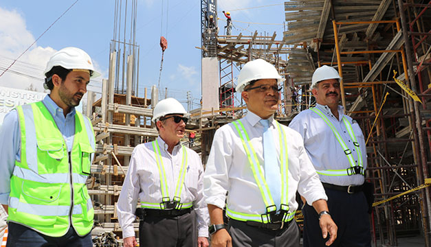 Ayer, el vicepresidente de la República, Óscar Ortiz, junto al presidente de Inversiones Bosh, Antonio Safie, y el director ejecutivo, Óscar Safie, realizaron un recorrido para verificar los avances de esta obra: una torre de lujo que albergará un centro comercial, un hotel y oficinas corporativas.