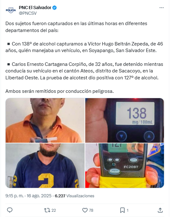 La Policía Nacional Civil (PNC) detuvo a dos conductores peligrosos con más de 120 grados de alcohol en las últimas horas.