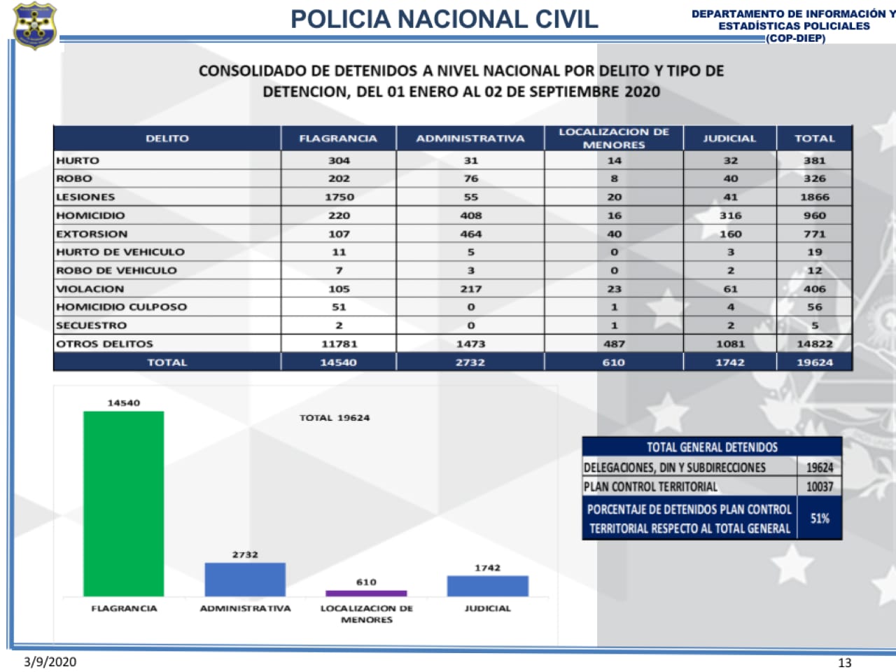 La PNC indicó que de los 19,624, un total del 51 por ciento fueron detenidos con la implementación del Plan Control Territorial, que equivale a 10,037 personas.
