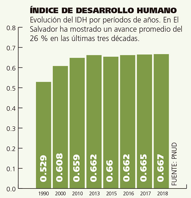 Pese a ese progreso, destaca el PNUD, el ritmo al que se mejora el desarrollo de los salvadoreños se ha reducido en los últimos 10 años. El Salvador logró que su IDH creciera entre 1990 y 2000 a una tasa promedio de 1.4 %, luego de 2000 a 2010 el desempeño se colocó en 0.82 % y, en el período de 2010 a 2018, el avance fue de 0.14 %.