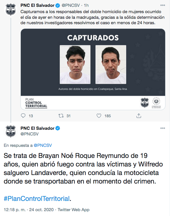 La PNC dice en su cuenta oficial de Twitter que los capturados son Brayan Noé Roque Reymundo de 19 años, quien según las autoridades “abrió fuego contra las víctimas” y también ha detenido a Wilfredo Salguero Landaverde “quien conducía la motocicleta donde se transportaban en el momento del crimen”, señala la Policía.