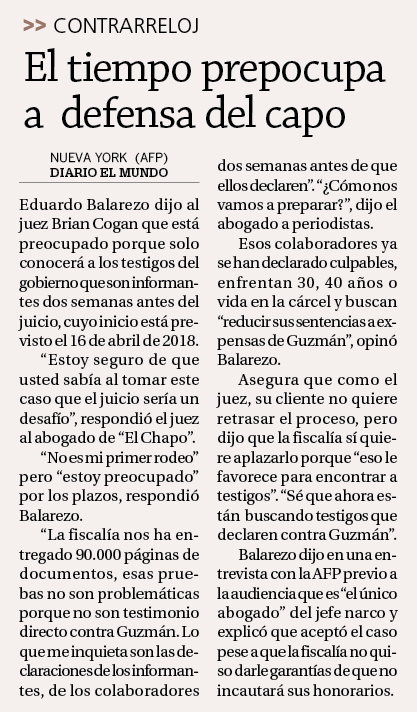 “Quiero estar seguro de que está bien”, asegura su abogado Eduardo Balarezo en una carta a Brian Cogan, solicitando que una experta de la Johns Hopkins pueda visitarle para evaluarlo y llegar a un diagnóstico. Atribuye este deterioro mental a las condiciones “extremas” de su reclusión. “Hemos notado que empezó a repetirse con frecuencia y que a veces se olvida de lo que hablamos”, señaló el abogado, “es incapaz de recordar personas, lugares y eventos”. Es más, advierte de que si el deterioro continúa, Guzmán podría llegar a ser declarado incompetente para el juicio.