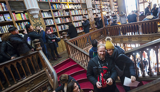 Con aparatos fotográficos en las manos, decenas de personas hacen la cola para visitar la librería situada en el centro histórico de Oporto, convertida en una de las principales atracciones turísticas de la ciudad del norte de Portugal.