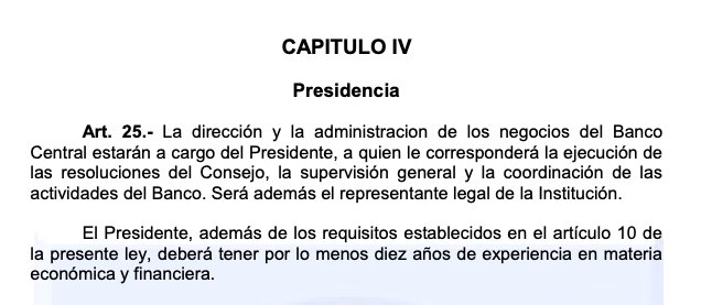 La Ley Orgánica del BCR dicta lineamientos del perfil del presidente de la institución, tal cual en el artículo 25 se establece que deberá “tener por lo menos 10 años de experiencia en materia económica y financiera”.