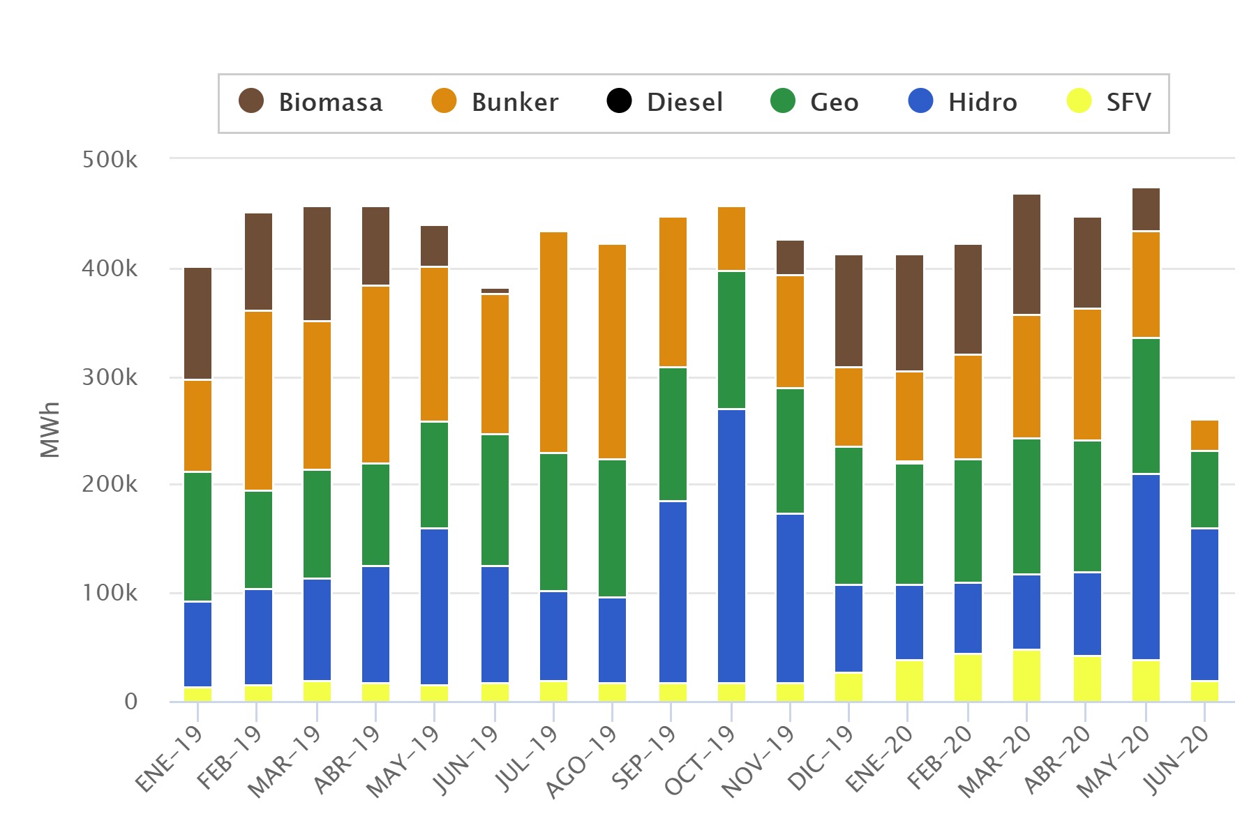 Generación mensual en El Salvador al 20 de junio pasado. Datos del CNE indican que las tecnologías geotérmica e hidroeléctrica mantuvieron mayor participación.
