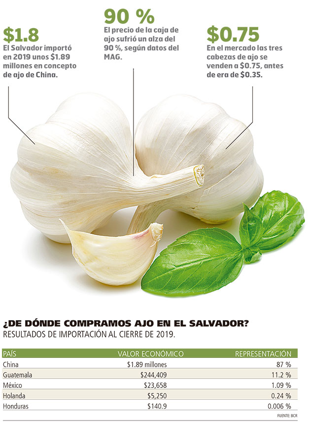 Los datos del BCR indican que El Salvador importó $2.17 millones en concepto de ajos al término de 2019. De esta suma, $1.89 millones se compraron a China y equivale al 87 % del total.
