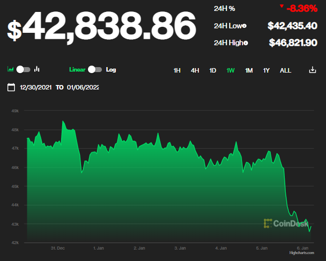 Hasta las 5:00 a.m. del jueves 6 de enero, el valor de la más popular de las criptodivisas se mantenía con una acentuada tendencia a la baja y operaba en la banda de los $42,800 con un mínimo de $42,435