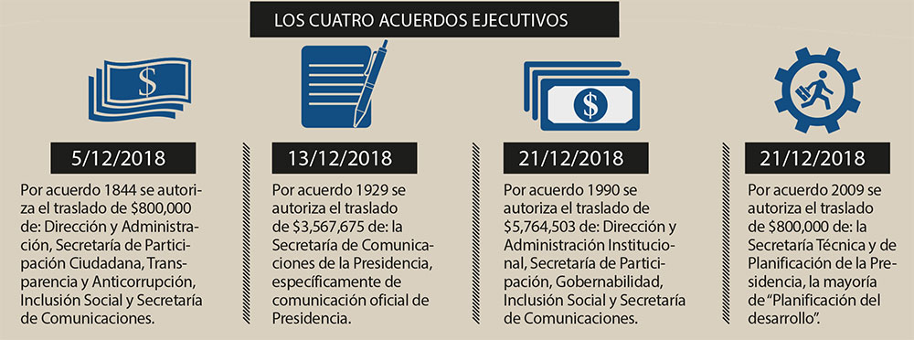 El 5 de diciembre de 2018, fue firmado el primer acuerdo de 2018 que permitió mover $800,000 de remuneraciones asignadas a la Administración General, la Secretaría de Participación Ciudadana Transparencia y Anticorrupción (STPA), la Secretaría de Gobernabilidad, Secretaría de Inclusión Social y la Secretaría de Comunicaciones de la Presidencia, hacia la partida de gastos reservados 54315.