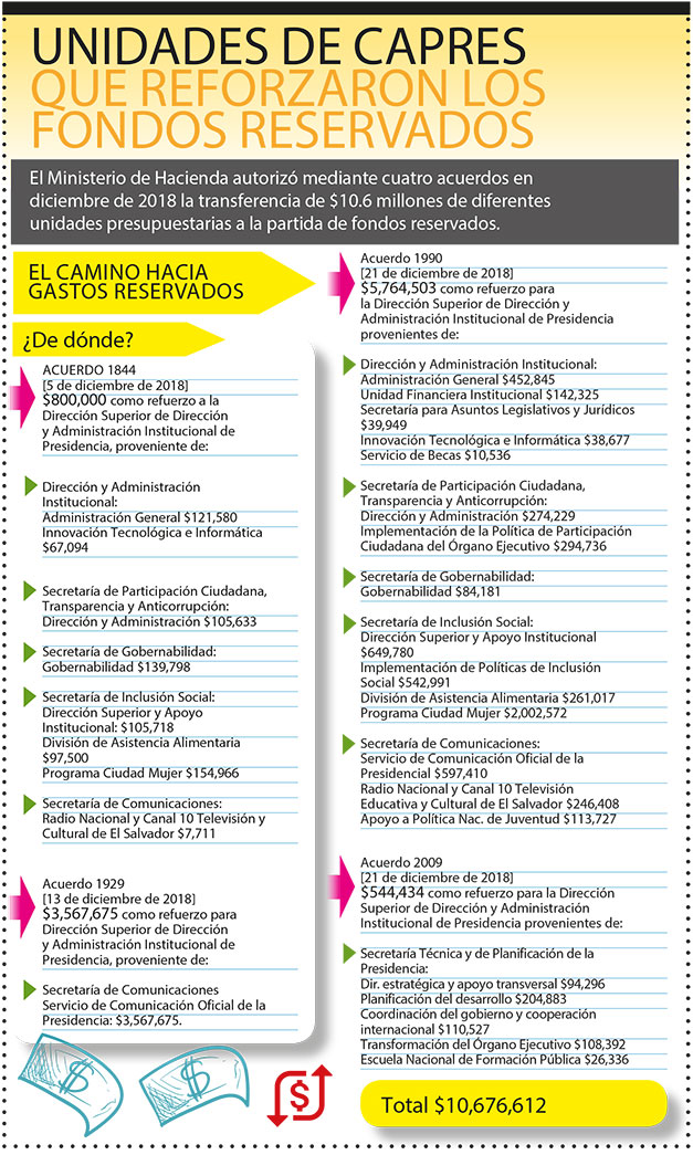 El Ministerio de Hacienda aprobó cuatro acuerdos ejecutivos en diciembre de 2018 para reforzar de dinero de seis unidades presupuestarias con $10,676,612 los gastos reservados de la Presidencia de la República.
