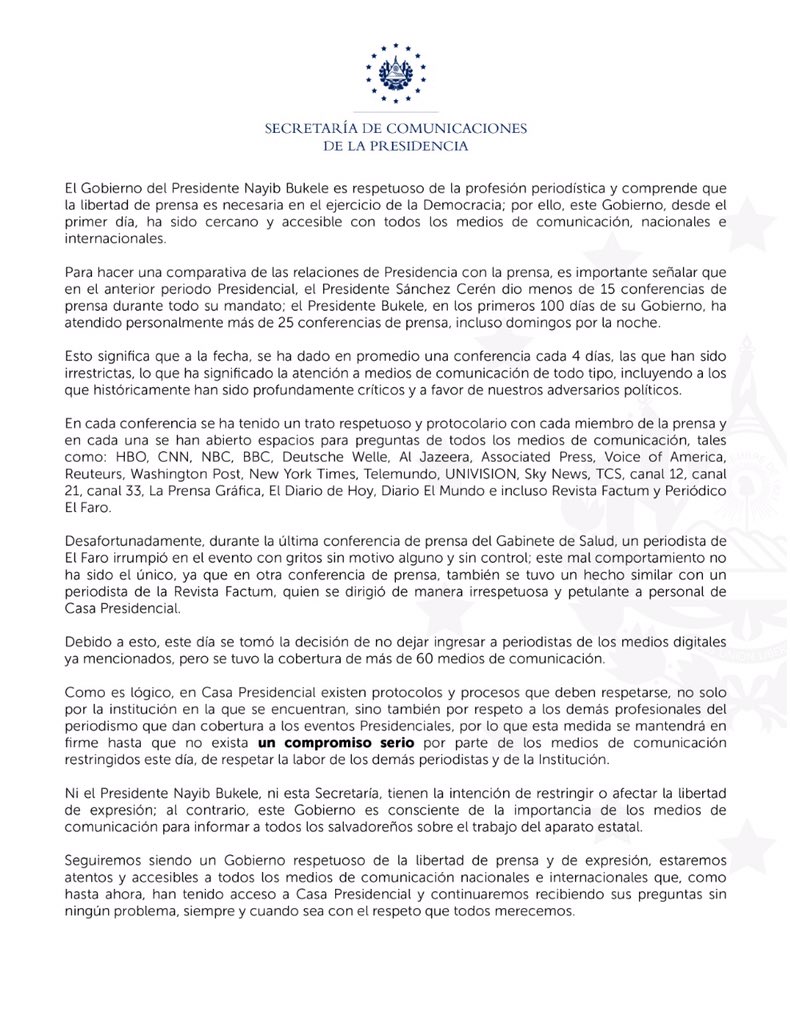 De acuerdo al comunicado, durante la última conferencia de prensa del gabinete de Salud, un periodista de El Faro irrumpió con gritos. "Este mal comportamiento no ha sido el único, ya que en otra conferencia de prensa, también se tuvo un hecho similar con un periodista de la Revista Factum, quien se dirigió de manera irrespetuosa y petulante a personal de Casa Presidencial", explica el comunicado.