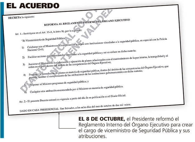 La reforma fue realizada el 8 de octubre de 2020 y el nombramiento, ad honorem, el 9 de octubre. Tendrá como responsabilidad “colaborar con el ministro en la coordinación y enlace con instituciones vinculadas a la seguridad pública”, en especial con la PNC.