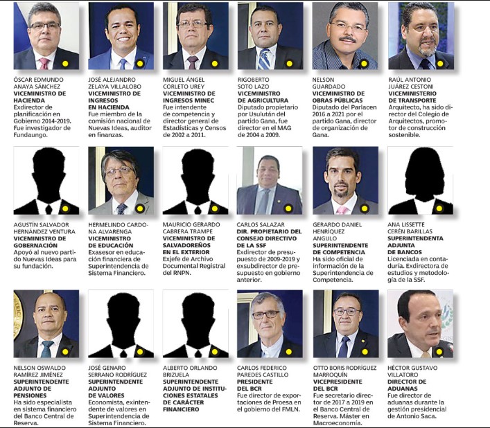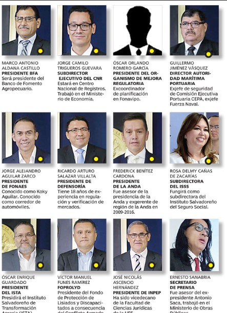El presidente del Banco Central de Reserva (BCR) será Carlos Federico Paredes, el vicepresidente, Otto Rodríguez Marroquín, el presidente del Banco de Fomento Agropecuario (BFA), Marco Aldana, el subdirector del Centro Nacional de Registros (CNR), Jorge Camilo Trigueros, el director del Organismo de Mejora Regulatoria, Óscar Romero García y el presidente de la Administración Nacional de Acueductos y Alcantarillados (Anda), Frederick Benítez Cardona y el director de Aduanas, Héctor Gustavo Villatoro.