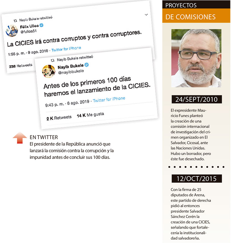 En septiembre de 2015, FMLN, Gana y PCN rechazaron una CICIES, mientras Arena pedía crearla. En 2018, se convirtió en promesa de Gana y del presidente Bukele.
