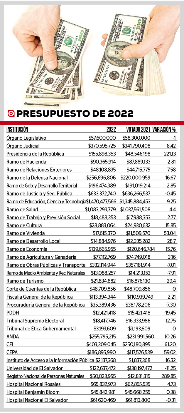 El anteproyecto de presupuesto de 2022 registra el mayor aumento porcentual en el Registro Nacional de Personas Naturales (RNPN), que pasaría a tener un presupuesto $50,023,955, 289.85% superior al monto de 2021, de $12.8 millones.Por la expedición de Documentos de Identificación tiene asignados $42,640,680. También aumenta la Comisión Ejecutiva Hidroeléctrica del Río Lempa (CEL) tendría un aumento del 61.2% para el próximo año, con un presupuesto de $403,309,045.