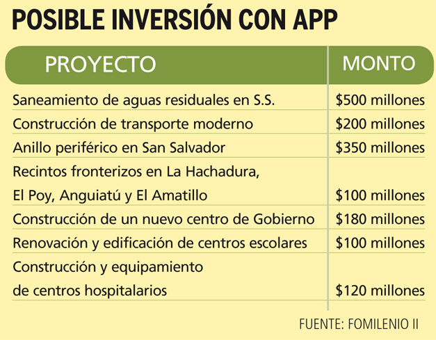 Entre estos posibles APP, el más oneroso es un proyecto de saneamiento de las aguas residuales del Gran San Salvador por hasta $500 millones, además de otro por $350 millones para la construcción de un anillo periférico en los corredores norte y sur de San Salvador.