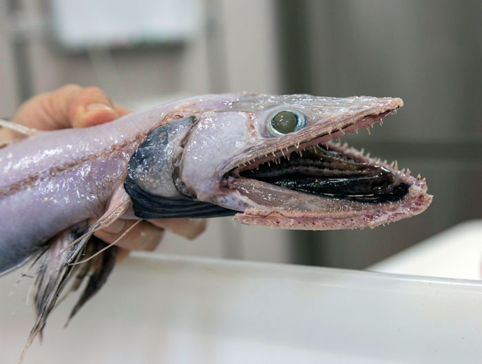 Otras estrellas de la muestra son un tiburón biolumiscente con dientes afilados como cuchillos, un espantoso pez lagarto o el gracioso pez trípode, que espera en el fondo del mar que la comida llegue a su alcance.